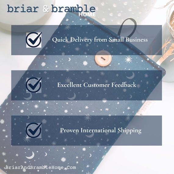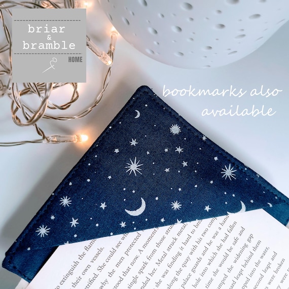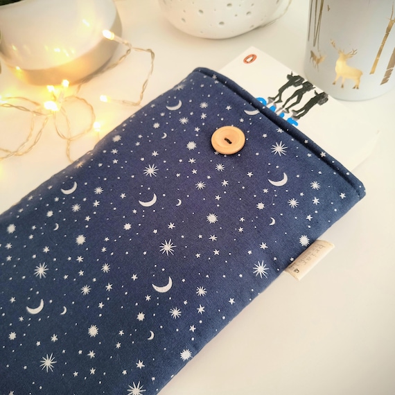 Starry night navy cotton print with silvery grey star and moon print, lined in co-ordinating fabric. These are ideal for throwing in your bag or car for home or for travel. Handmade from cotton poplin with soft interior and lined with a soft medium weight wadding, this is just the loveliest snug for your current read. No more wrecked pages, it is perfect too for all those seemingly lost hours spent waiting for trains, appointments or children's activities.