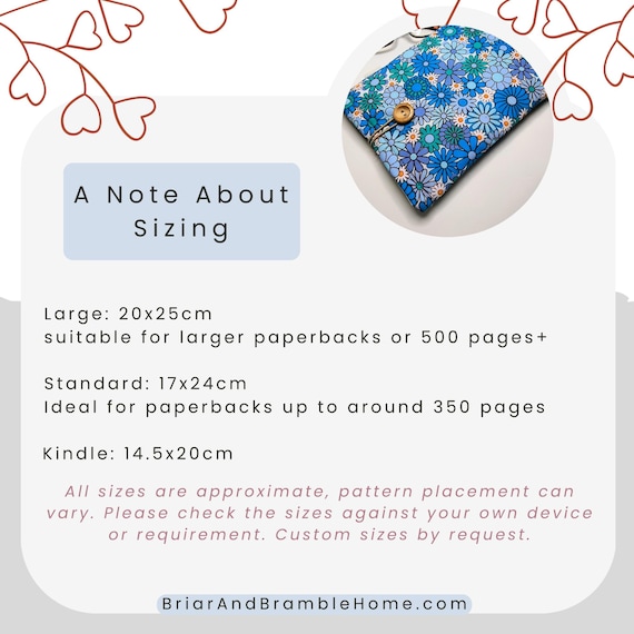 Plenty more book sleeves to choose from here: https://www.etsy.com/uk/shop/BriarAndBrambleHome?ref=shop-header-name&listing_id=1663449898&from_page=listing§ion_id=47680106