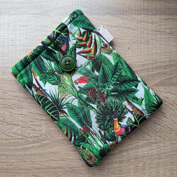 Cotton exterior fabric with fun tropical print, lined with wadding and green interior fabric.