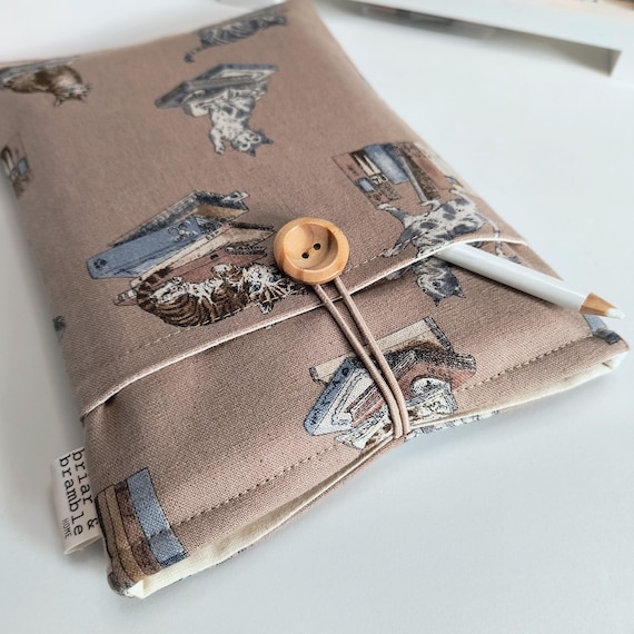 The cutest kittens and cats putting them paws all over those books! Sweet cat print on buff linen with calico lining. These book sleeves are gently padded to protect those pages. Japanese Cotton Linen Fabric with a medium weight.