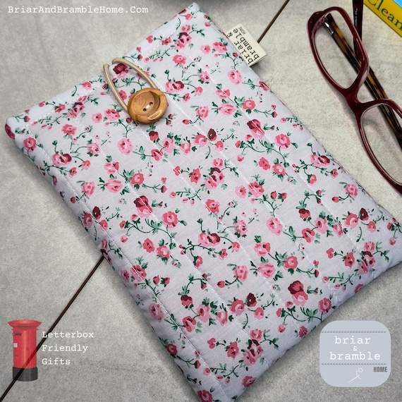 Handy Kindle Sleeve in this cute white and pink traditional roses design, this sits elegantly on your bedside table or in your handbag. Ideal covers for journaling notebooks or novels alike, available in a variety of different sizes for Kindles or Books. Custom options are available, just ask.