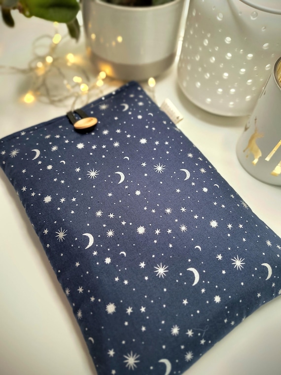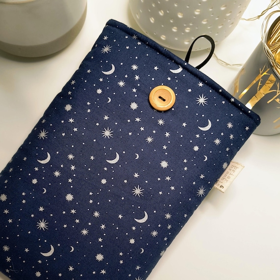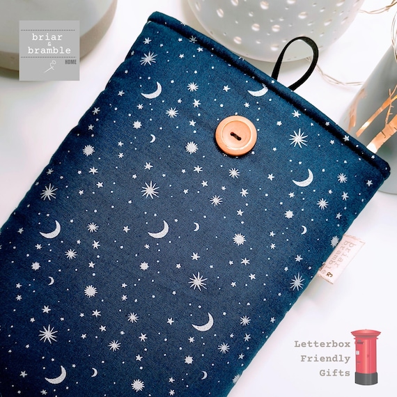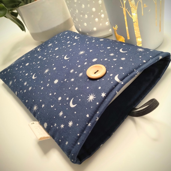 Starry night navy cotton print with silvery grey star and moon print, lined in co-ordinating fabric. These are ideal for throwing in your bag or car for home or for travel. Handmade from cotton poplin with soft interior and lined with a soft medium weight wadding, this is just the loveliest snug for your current read. No more wrecked pages, it is perfect too for all those seemingly lost hours spent waiting for trains, appointments or children's activities.